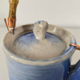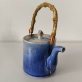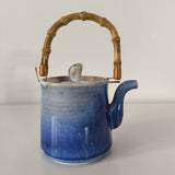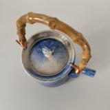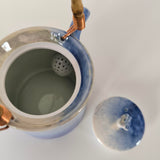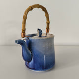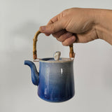 La théière japonaise peut prendre plusieurs formes selon la position de sa poignée. Voici une Dobin Kyusu avec une anse située au-dessus de la théière. C'est une théière artisanale unique en porcelaine bleue de Jingdezhen, adaptée à la préparation de tout type de thé grâce au filtre fin intégré devant le bec et la céramique neutre.