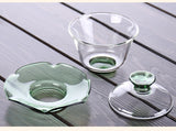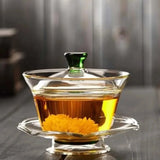 Matière : Corps du gaiwan en verre borosilicate transparent, bouton de couvercle +/- soucoupe en verre teinté