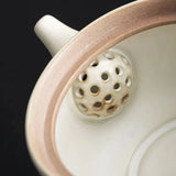 Filtre : grès, type boule à trous, intégré à la théière devant le bec verseur