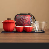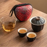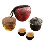 Ce Petit Service à Thé nomade est ce qu'il vous faut pour partir au bout du monde (ou dans votre jardin) et y préparer des thés variés au gong fu cha pour 2 personnes. Il est composé d'une théière chinoise appelée gaiwan, d'une verseuse en verre et de 2 petites tasses pour partager vos dégustations. L'ensemble est protégé dans un bel étui rigide.