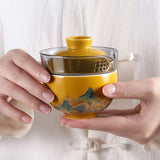 Matière : théière en verre (corps) et porcelaine (couvercle) - tasses en porcelaine