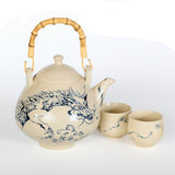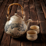 Voici une superbe grande théière en grès avec anse en bambou et ses 2 petites tasses assorties. Un Service à Thé Artisanal en grès blanc émaillé, orné d'un impressionnant dragon bleu créé à 4 mains en Belgique. Un service parfaitement unique.