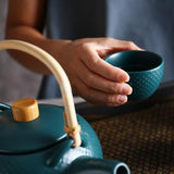 Sobriété, pureté et minimalisme caractérisent ce beau Service à Thé en Céramique. Il est composé d'une théière en porcelaine de style japonais munie d'une belle anse en bambou et ornée du motif arare, et de ses 4 tasses assorties. Cette théière pourra infuser tous les types de thé grâce à la céramique sans mémoire. Prenez le temps du thé avec ce service élégant qui s'intégrera, dans sa version blanche ou verte, dans tous les styles d'intérieur.