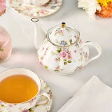 Ce Service à Thé Fleuri de style anglais, en porcelaine chinoise, se compose d'une théière de 400ml et ses 2 tasses assorties avec soucoupes et cuillères. Vous pourrez y infuser vos thés fleuris mais aussi, grâce à la céramique sans mémoire, tous les autres !