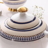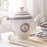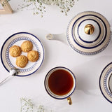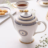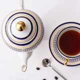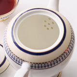Pour une dégustation à l'anglaise réussie, un afternoon tea ou une tea party, voici un magnifique Service, idéal pour le Thé Anglais (même le plus corsé !) en porcelaine fine de qualité neutre et sans mémoire. On aime sa porcelaine Bone China fine et blanche et son motif bleu et doré en sur-vitrage de style marocain. C'est un service à thé pour 2 personnes comprenant une théière et 2 tasses assorties avec leur soucoupe et leur cuillère. Un très bel ensemble, même si vous pouvez choisir séparément la théière et la tasse.