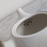 Filtre : Porcelaine, à trous, intégré à la théière devant le bec verseur