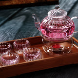 Une Théière en Verre de Style Anglais qu'on croirait tout droit sortie du conte de Cendrillon avec sa forme originale de citrouille ! Cette théière en verre borosilicate peut être utilisée comme bouilloire et sa transparence vous permettra d'admirer l'éclosion de votre fleur de thé ou de faire infuser tous vos thés même les plus fragiles dans le filtre en verre amovible. Cerise sur la pumpking pie, nous vous proposons en option d'adorables petites tasses en verre double paroi et un beau réchaud à théière en verre.