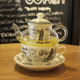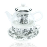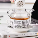 Matière : Théière en verre - Tasse, soucoupe, filtre et couvercle en porcelaine à la cendre d'os