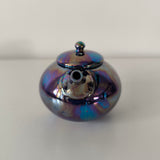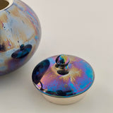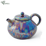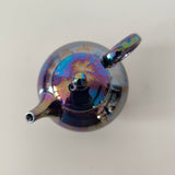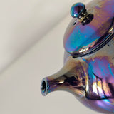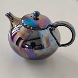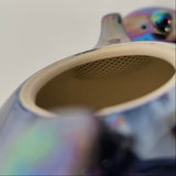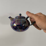 Voici une Théière Japonaise Emaillée des plus originales. Les artistes de Tokoname ont pour habitude de ne pas émailler leurs théières, laissant l'argile parler d'elle-même. Le potier Yukata Tsuzuki ne fait pas exception, connu pour ses délicats motifs floraux dansant sur une surface yakishime subtilement texturée. Mais il a également développé son style personnel et reçu de nombreux prix pour sa maîtrise de la technique du lustre, décoration dite yōhen-yuyaku (窯変釉薬) ou émaillage à effet métallique irisé. Cette superbe théière que l'on croirait plongée dans un bain d'essence en est un magnifique exemple.