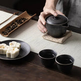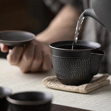 Cette Théière Japonaise Vintage est issue des fours de Dehua, célèbre pour sa céramique de haute qualité. Un Hohin Kyusu qui verse et infuse parfaitement tous les types de thés grâce à son filtre situé devant le bec et sa céramique sans mémoire. Il est proposé avec ses 2 tasses assorties et son étui de transport rigide.