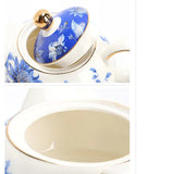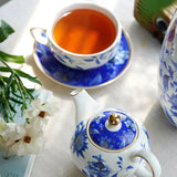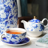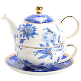 Cette Théière en Porcelaine Blanche et Bleue est une théière dite solitaire ou égoïste, un service à thé individuel en porcelaine Bone China de qualité. Il est composé d'une théière avec tasse et soucoupe assorties. On aime sa céramique résistante aux rayures et aux tâches, sa forme ronde et son motif fleuri poétique.