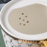 Filtre : Porcelaine, à trous, intégré à la théière devant le bec verseur