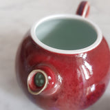 Il serait trop simple de vous dire : voici une magnifique Théière Rouge. Car il ne s'agit pas seulement d'une théière rouge. C'est aussi une théière rouge irisée de violet et de bleu, une théière rouge en porcelaine chinoise fabriquée de manière artisanale à Jingdezhen, une petite théière rouge de grande qualité au versement parfait munie d'un filtre boule multi-trous et idéale pour découvrir et déguster de nouveaux thés au Gong Fu Cha. Un modèle unique.
