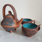 Cette théière artisanale, le pichet et les 2 tasses assorties sont uniques et façonnées à la main. La cuisson à très haute température de la théière la rend imperméable et neutre pour infuser toutes les sortes de thés.