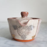 Cette poétique petite Théière est un Shiboridashi, théière japonaise de petite capacité et d'ouverture large pour permettre l'infusion optimale de feuilles de thé vert japonais. Elle ne possède pas de poignée, et c'est son couvercle qui sert à filtrer les feuilles. La verse est rapide, le thé étant uniquement guidé par les stries présentes au niveau du bec verseur.