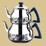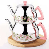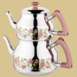 Avez-vous déjà essayé une Théière pour Thé Turc ? Voici l'occasion grâce à cette théière double en inox, caydanlik en turc, très simple d'utilisation. En bas l'eau à faire bouillir dans la bouilloire, en haut le thé à faire infuser dans la théière. Simple comme bonjour non ?