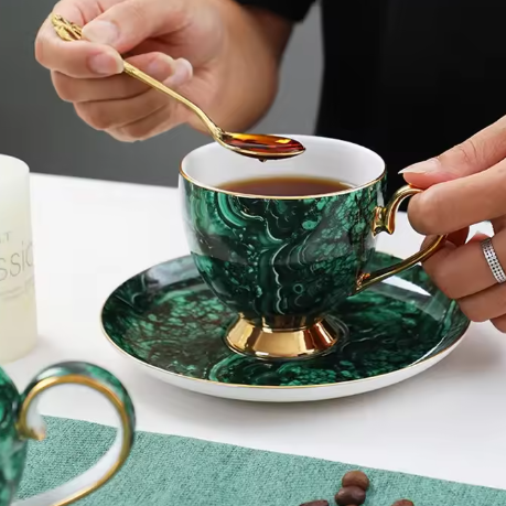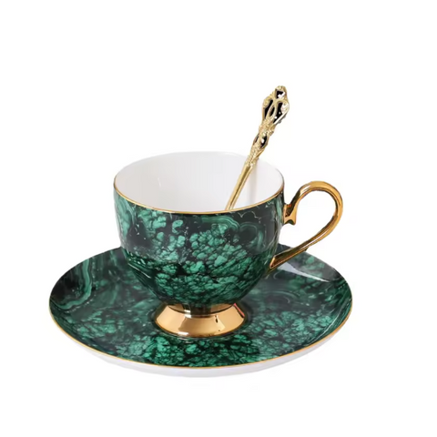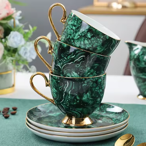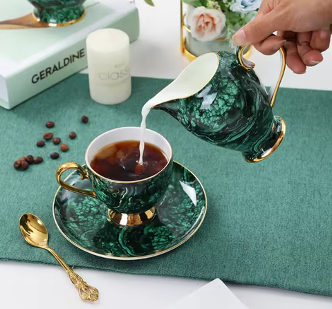 Un Tea Time typiquement british pour ceux qui n'aiment pas les fleurs avec notre Service à Thé Marbre et son motif contemporain. Pas question pour autant de sacrifier la qualité avec la porcelaine de Chine à la cendre d'os, l'une des plus réputées au monde. Ce luxueux service à thé est composé d'une théière, un pichet à crème, un pot à sucre, 4 tasses avec soucoupes et cuillères dorées. Disponible en 2 coloris (contenances différentes).