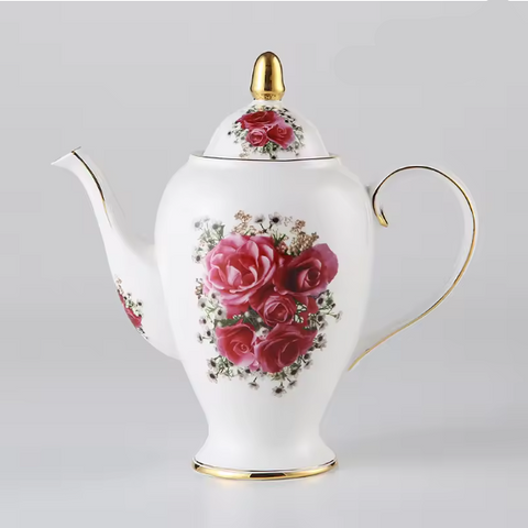 Boire son thé à l'anglaise dans de la Porcelaine de Chine, c'est ce que permet notre superbe Service à Thé Anglais en Porcelaine Bone China élégante et fleurie. Chaque élément est disponible séparément ou en service complet, incluant la théière, le sucrier, le pichet et 6 tasses avec leurs soucoupes, leurs cuillères et le support. LE cadeau de mariage parfait.