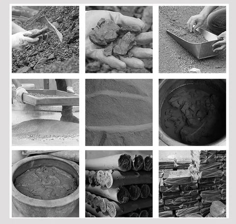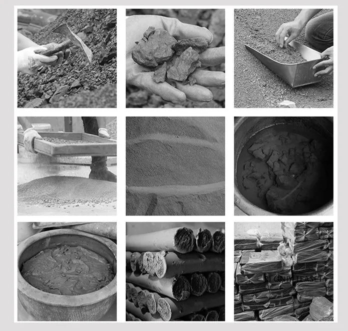 Les théières de Yixing sont fabriquées à la main et non tournées au tour de potier. L'argile dure est martelée avec un lourd maillet en bois pour former une plaque, le corps des théières est ensuite fabriqué selon trois techniques de base : moulé à la presse, rabattu, ou à la plaque. Des outils spécialisés en bois, bambou, métal et corne, créés à travers les siècles, sont utilisés au cours du processus de fabrication des théières de Yixing.