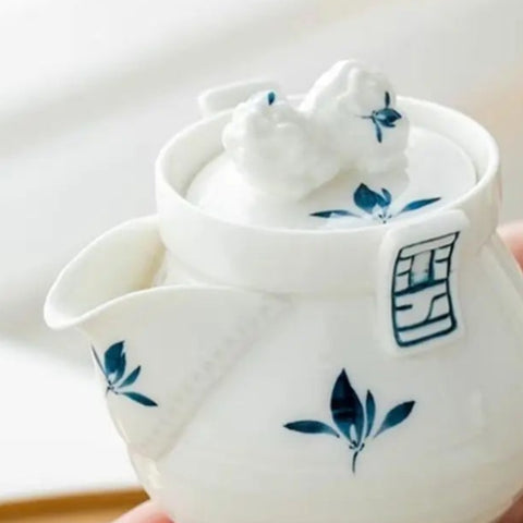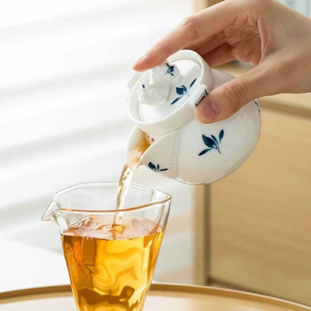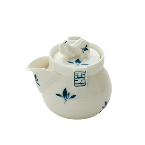Poétique et de qualité, cette petite Théière en Porcelaine Bleue et Blanche fleurie est un hohin kyusu, théière japonaise sans poignée adaptée aux thés infusés à température faible à modérée. Avec sa petite capacité et sa verse rapide, elle vous accompagnera dans vos dégustations selon la méthode asiatique en infusions multiples ou pour vos thés verts précieux.