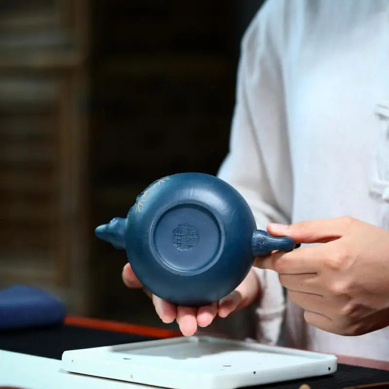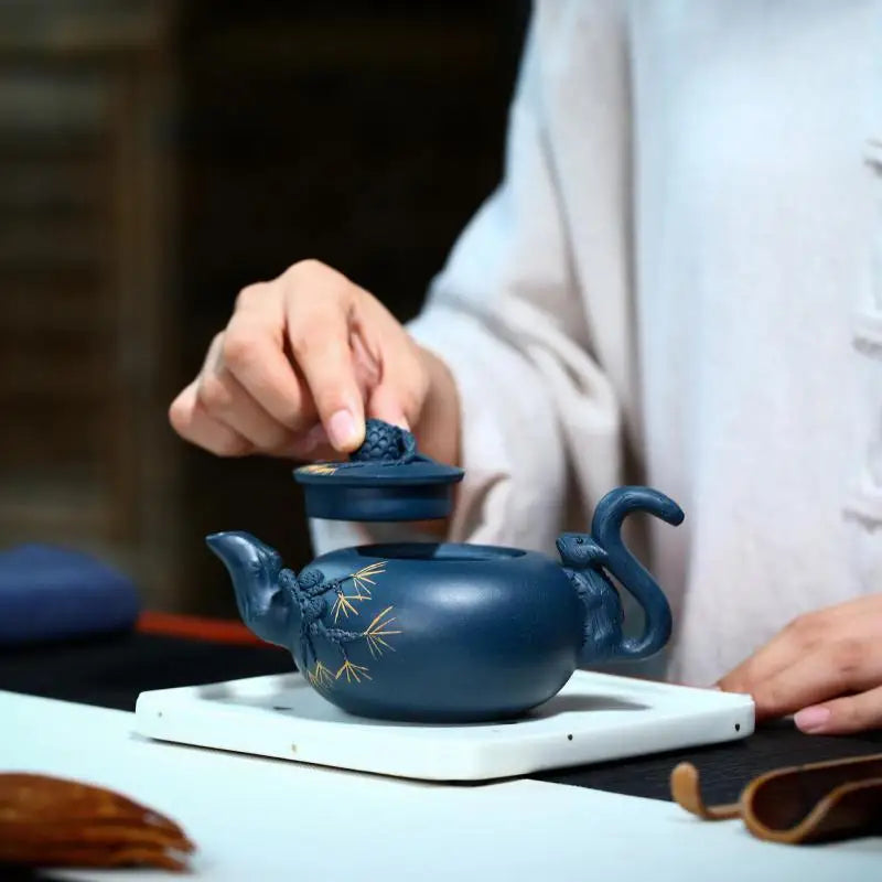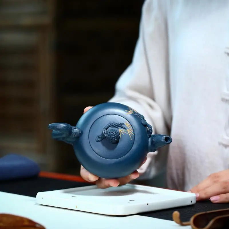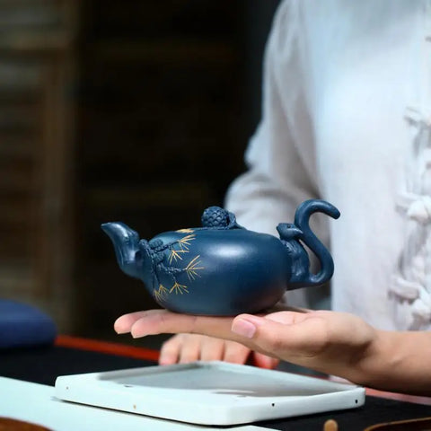 Cette Théière Bleue en Terre de Yixing est une pure beauté. Cet argile chinois est utilisé pour façonner des théières à mémoire qui subliment au fil du temps le goût des thés qui leur sont dédiés. Un adorable écureuil forme la poignée de cette magnifique théière façonnée à la main. Une théière de qualité à réserver à un seul type de thé, et un objet de collection !