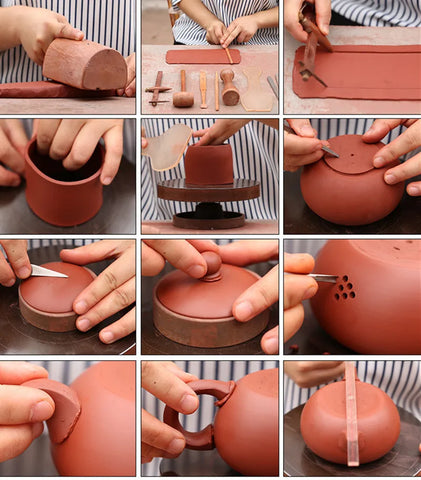 Les théières de Yixing sont fabriquées à la main et non tournées au tour de potier. L'argile dure est martelée avec un lourd maillet en bois pour former une plaque, le corps des théières est ensuite fabriqué selon trois techniques de base : moulé à la presse, rabattu, ou à la plaque. Des outils spécialisés en bois, bambou, métal et corne, créés à travers les siècles, sont utilisés au cours du processus de fabrication des théières de Yixing.