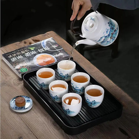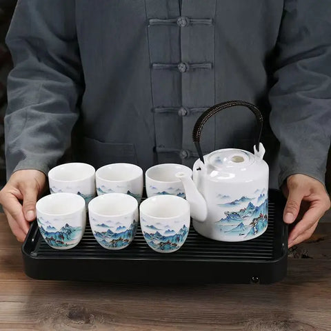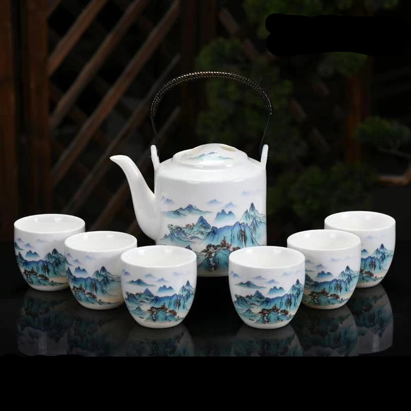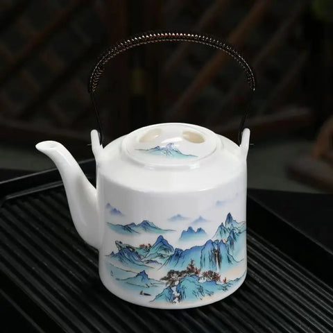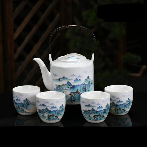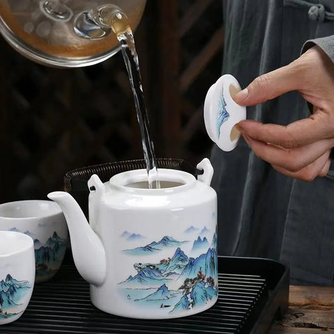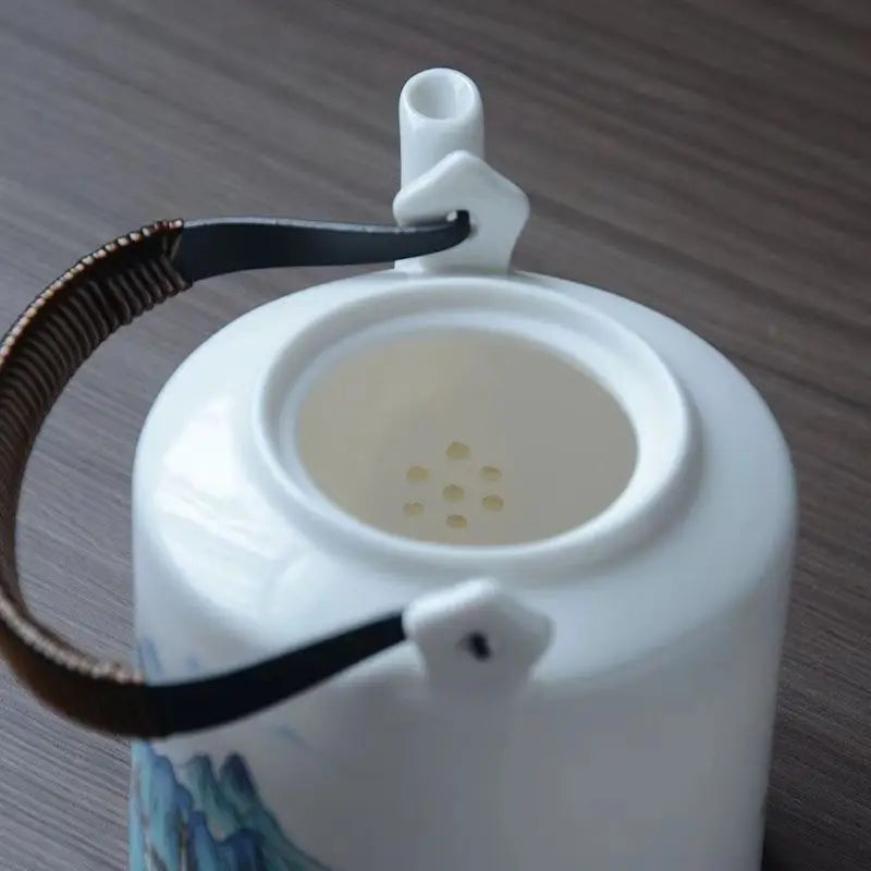 Ce Service à Thé en Porcelaine de Chine est composé d'une théière de 650ml décorée d'un paysage de montagne et de ses 4 ou 6 tasses assorties. Vos feuilles de thé en vrac disposeront de l'ensemble du corps de la théière pour se déployer grâce au filtre à trous intégré devant le bec. Un très beau cadeau à offrir à quelqu'un qu'on aime, ou à soi-même, parce qu'on est aussi quelqu'un de formidable ! La théière est également disponible seule.