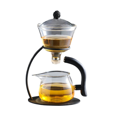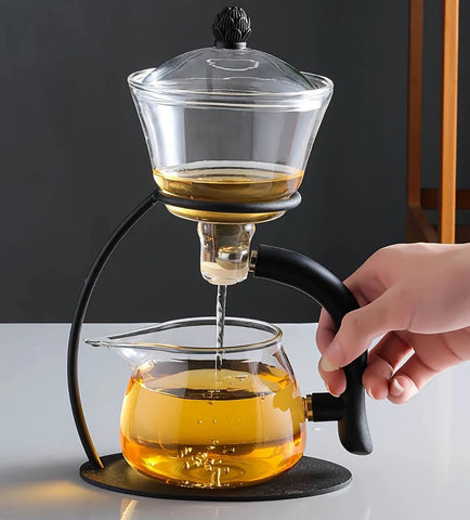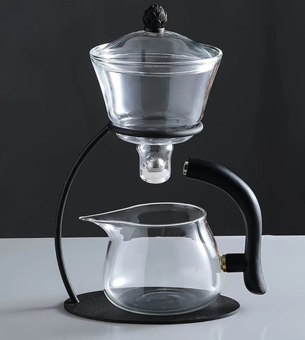Cette Théière Chinoise Design en verre est une variante semi-automatique du gaiwan, la tasse chinoise à couvercle. La théière-tasse en verre possède un fond tapissé d'un filtre sous lequel se trouve une bille en métal. Le pichet est quant à lui muni une poignée magnétique. Voyez-vous la technique ? Elle est très simple : approchez la poignée du pichet de la bille, celle-ci va se décaler légèrement, découvrant le fond et le thé va s'écouler automatiquement. Eloignez le pichet, la bille se remet en place, le versement s'arrête. On ne s'en lasse pas !