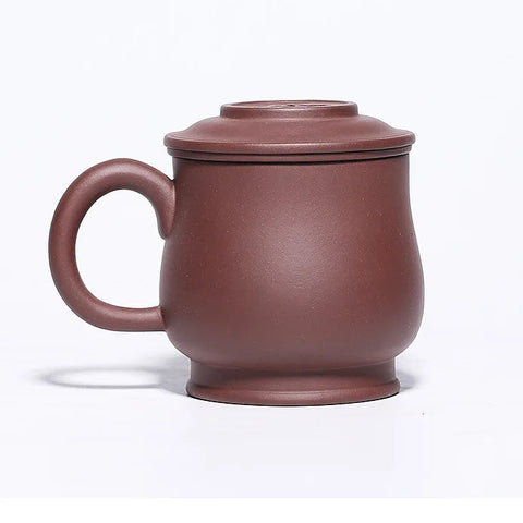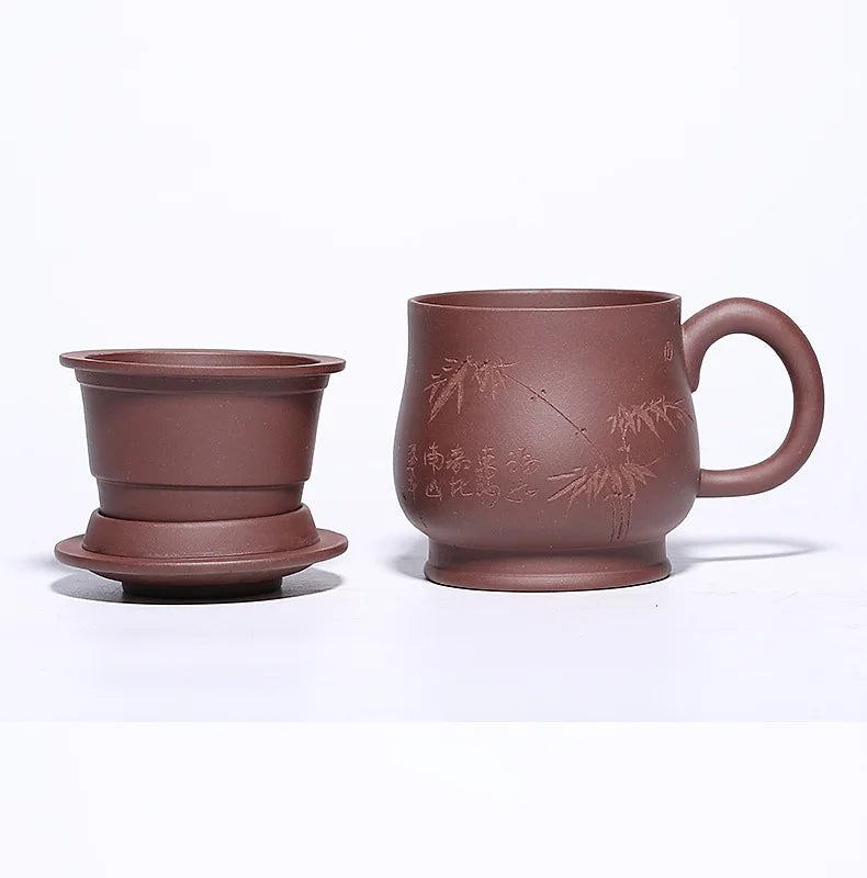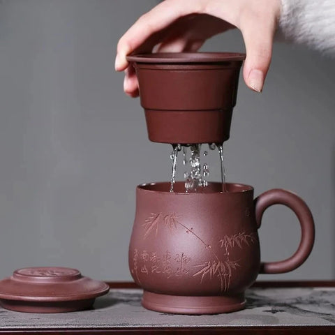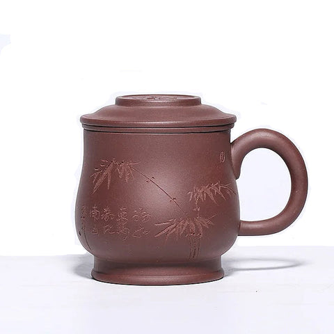 Pour bénéficier de la terre réputée de Yixing sans opter pour une théière, voici un élégant Mug en Argile avec filtre et couvercle. Cette grande tasse finement gravée à la main bénéficie des caractéristiques de la célèbre argile chinoise dite à mémoire, il faudra par conséquent réserver à ce mug la préparation d'un seul type de thé en vrac.
