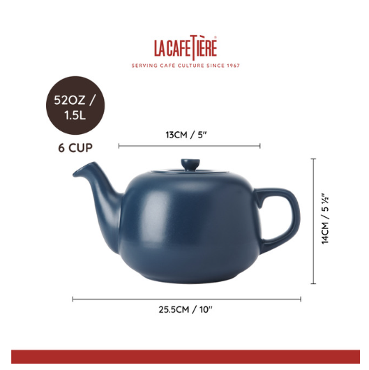 On aime le design anglais rétro, la céramique sans mémoire, le bec qui verse sans goutte et surtout le grand volume familial de cette Théière de 1,5L. Cette théière classique alliant élégance traditionnelle anglaise et fonctionnalité peut servir 6 grandes tasses ou 12 petites selon leur contenance. Disponible en 2 coloris, bleu marine ou blanc crème.